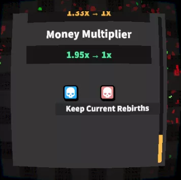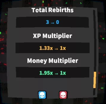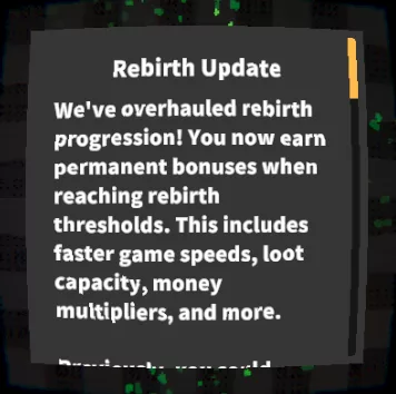Rebirthing now has a proper progression system, like levels do! At the moment, there are 14 unlocks across 100 Rebirths, but we may expand this in future updates ! The bonuses that this new system provides range from big stat increases, to unlocking whole new mechanics like the new speed-up and stash system!
