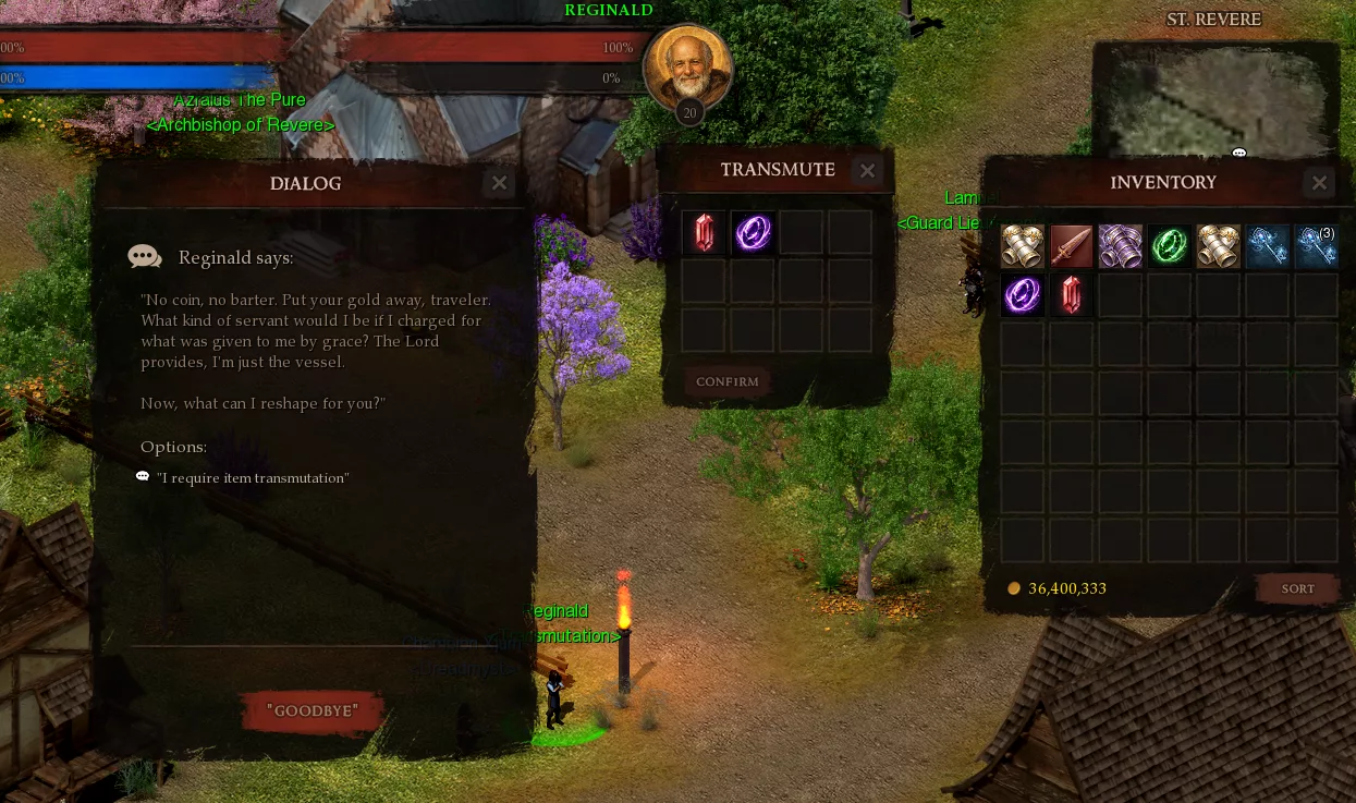 • Reginald in St. Revere can now perform Transmutation: Combine materials to create new items. For example, you can craft a Divine Orb from Major Orbs and reagents, upgrade Rough gems into Refined gems, or turn Major Potions into Major Serums. More recipes to come.