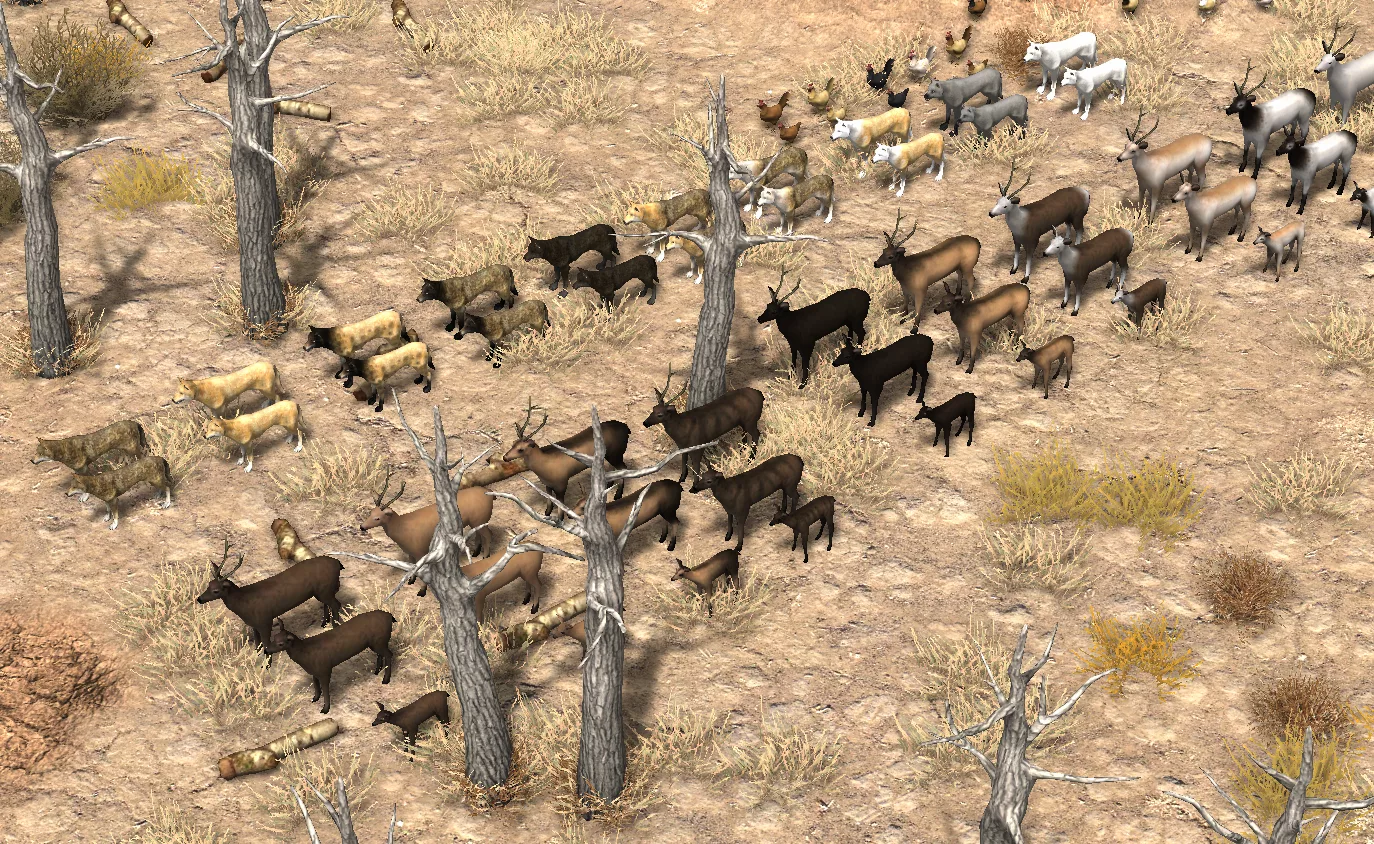 Wild animals will have more visual variety, each wild animal will have its own color (some more rare than other), size and visual difference depending the sex. But some colors can only be made by mixing races with the tamed ones. And they also have their own stats that you can inspect, so you can choose which animal you want to tame to add in your husbandry depending your needs.