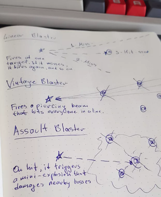 • 10+ weapon twists: I’m making sure every weapon has a gameplay hook, not just different numbers. Designed the old-school way – in my notebook (image below).