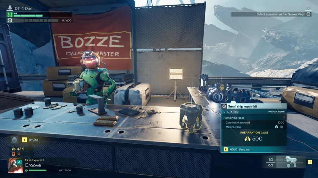 Bozze and Vosk will now sell various gear and Artifacts for Credits, allowing you to prep for missions. Up by the Shooting Range, player weapons are also available to buy with Credits. These are randomly refreshed every time you enter the hangar, and higher MK weapons can also spawn but cost more.