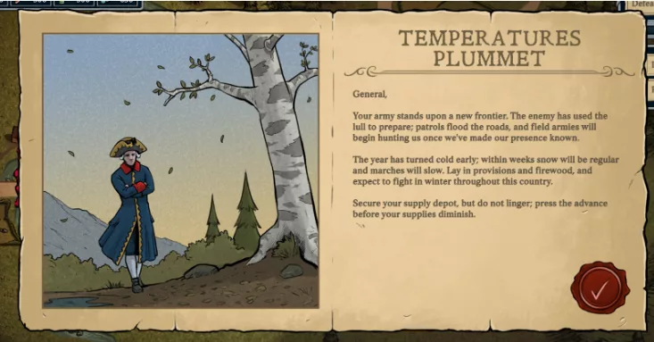 Popup notifications are finally finished being drawn and colored. There are now unique images for every type of popup including “War is Upon Us,” “Temperatures Plummet,” etc. We also fixed the “Scorched Earth” image which was cut up and bugged out.