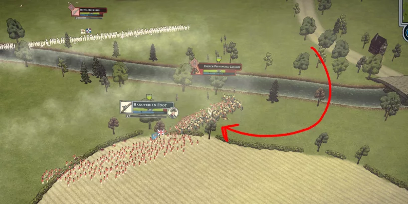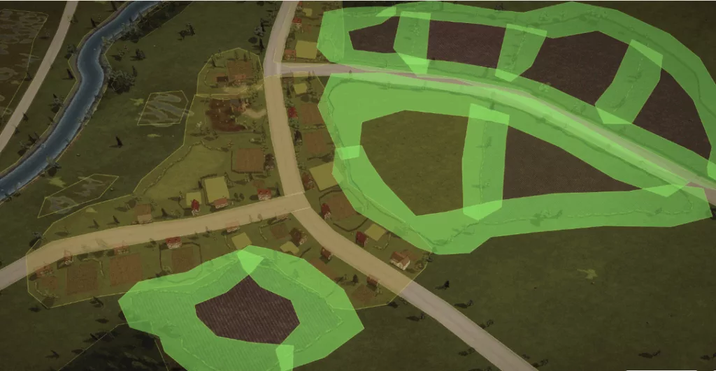 All cover zones have been expanded to be easier to utilize. Instead of needing to fit a regiment in a specific block of houses, you now get the cover of the buildings for just being in their general radius. Hedge cover has also been expanded to feel more consistent. Green zones in the picture below are hedge cover, yellow is for the town.