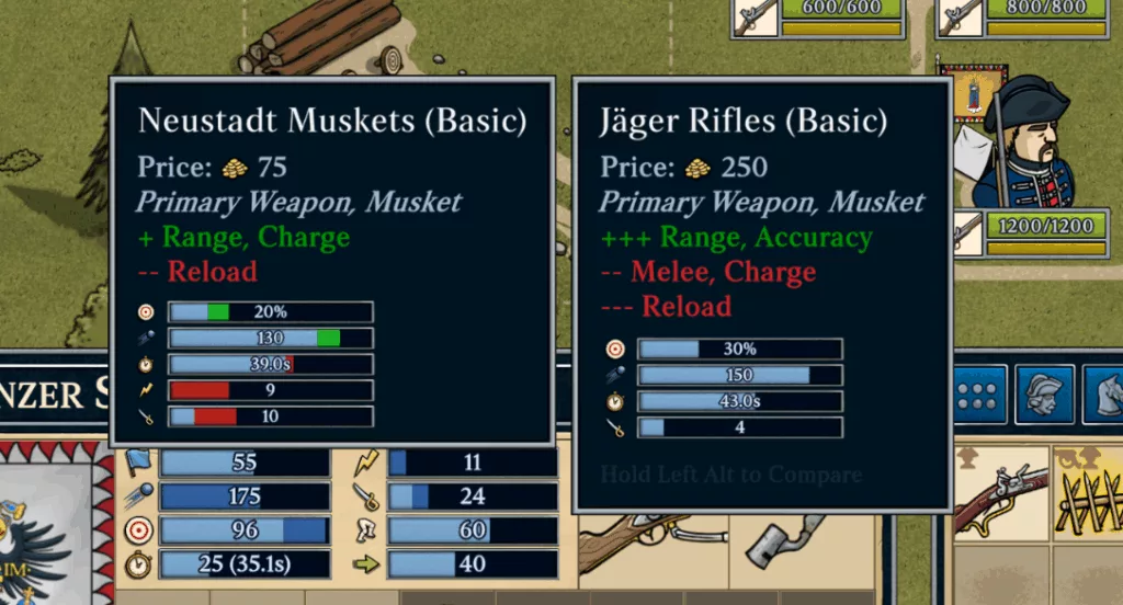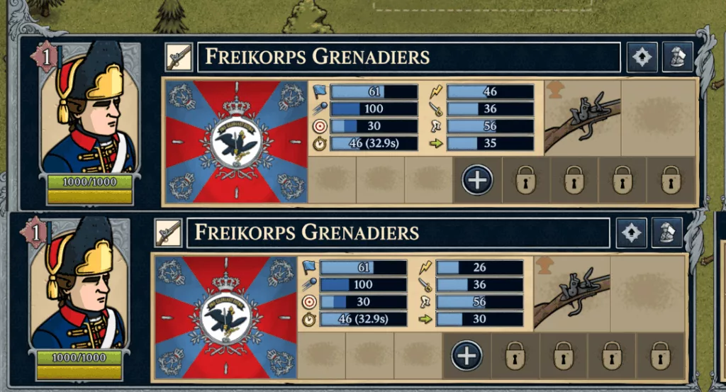 Fixed a UI bug where your stats weren’t displaying correctly when you upgraded a unit. Notice in the bottom image the Freikorps Grenadier is displaying as 26 charge damage despite having 46.