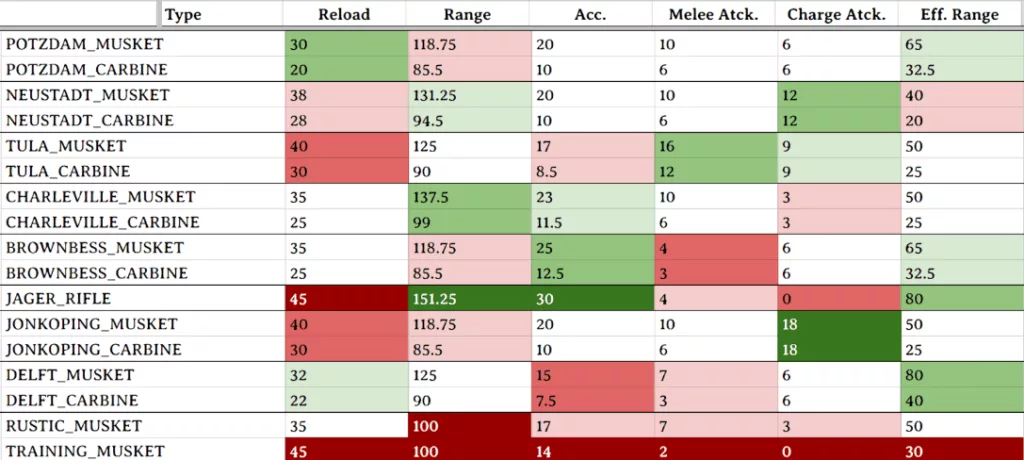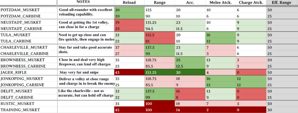 Have done an overhaul to the muskets. I previously had certain muskets with a proficiency or deficiency to “effective range,” which is a stat pretty much hidden from the player. The effective range determines when the damage begins to drop off shooting at far ranges. But because this isn’t displayed anywhere in the game and is a more passive mechanic, I rebalanced the muskets so they all use the same effective range which makes the muskets feel consistent when firing at closer ranges. I think this makes more sense from a historical perspective anyways since none of the muskets are rifled and so they’ll all mostly have a similar effective range. Here’s the new chart of weapons, and I believe I made some of the lesser-used weapons like the Delft more viable.