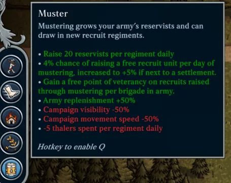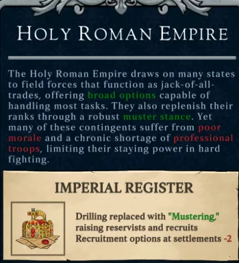 They get a new stance called “Mustering” which lets you drum up fresh reservists. There’s a small percentage chance you get a free recruit while mustering as well, and this chance is increased if you’re close to a settlement. The theme for the HRE is diverse units, and luck!
