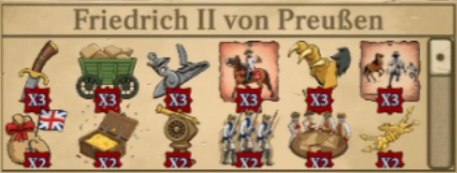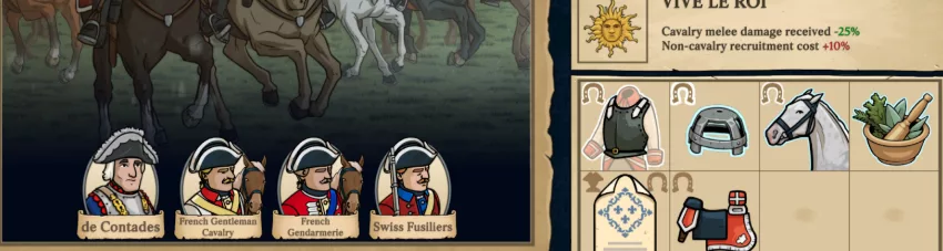 “France can *expand rapidly* with renowned *heavy cavalry*, excelling in sweeping, overwhelming assaults. Yet their lower ranks are #disorganized#, and the strain of supplying so many men is worsened by #poor logistics#, as corruption and lavish spending drain resources. When their spirit holds, however, French armies can deliver devastating blows on the battlefield.”