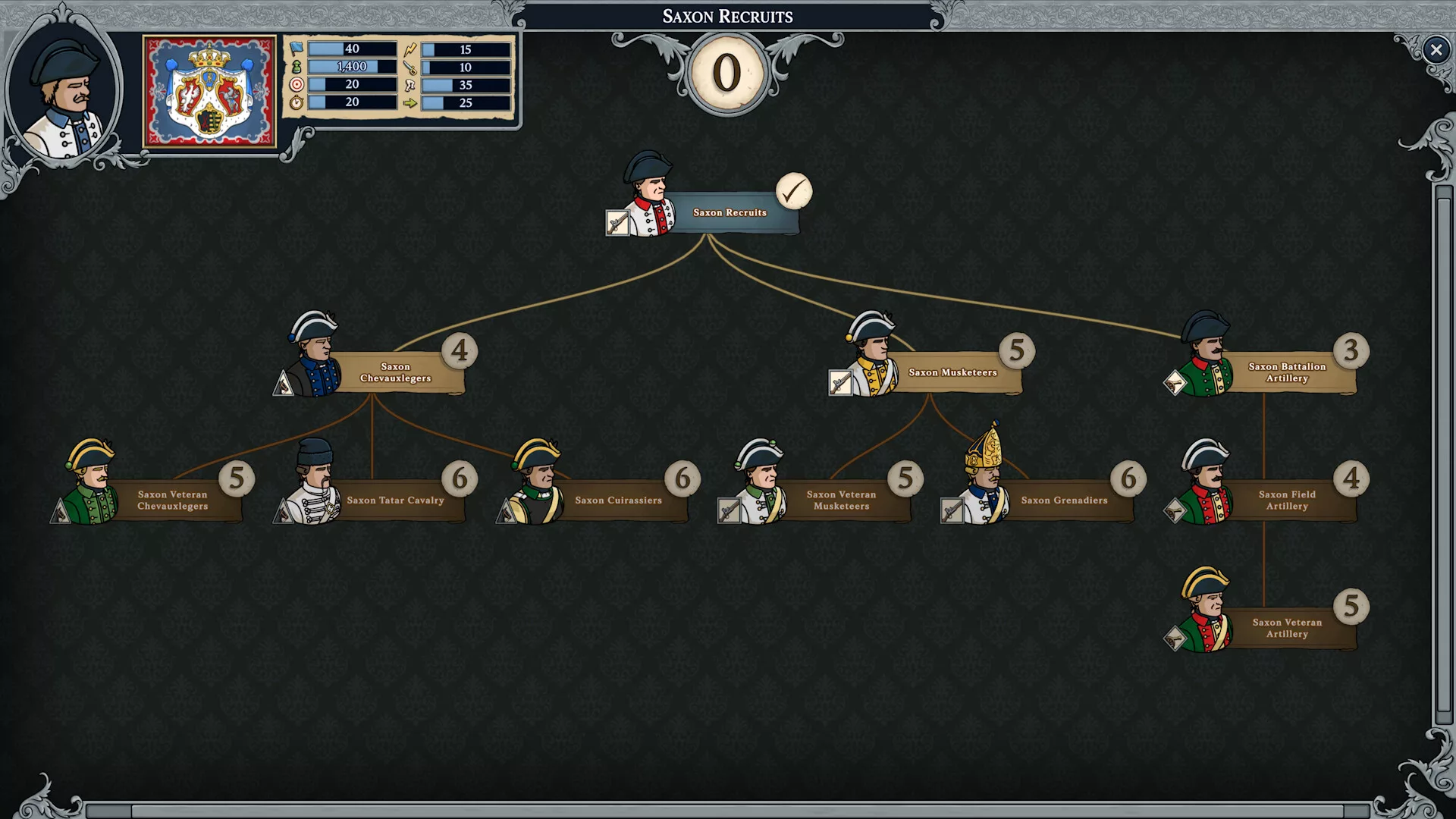 – Here’s the Saxon Army. Their bonus is that the new mustering stance generates additional reservists per regiment, letting you muster up large amounts of reservists quickly. Their malus is that units must be purchased using reservists, which makes it a little harder to balance your resources. However, you can take advantage of this using the muster stance and build up reservists that way.