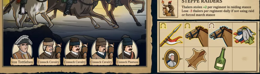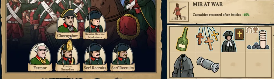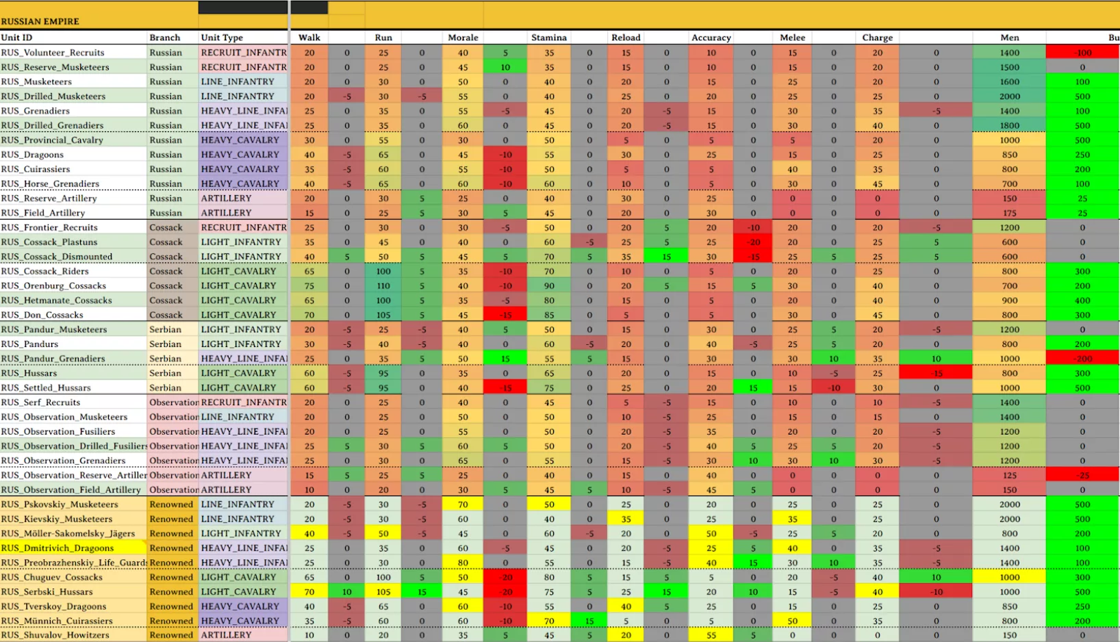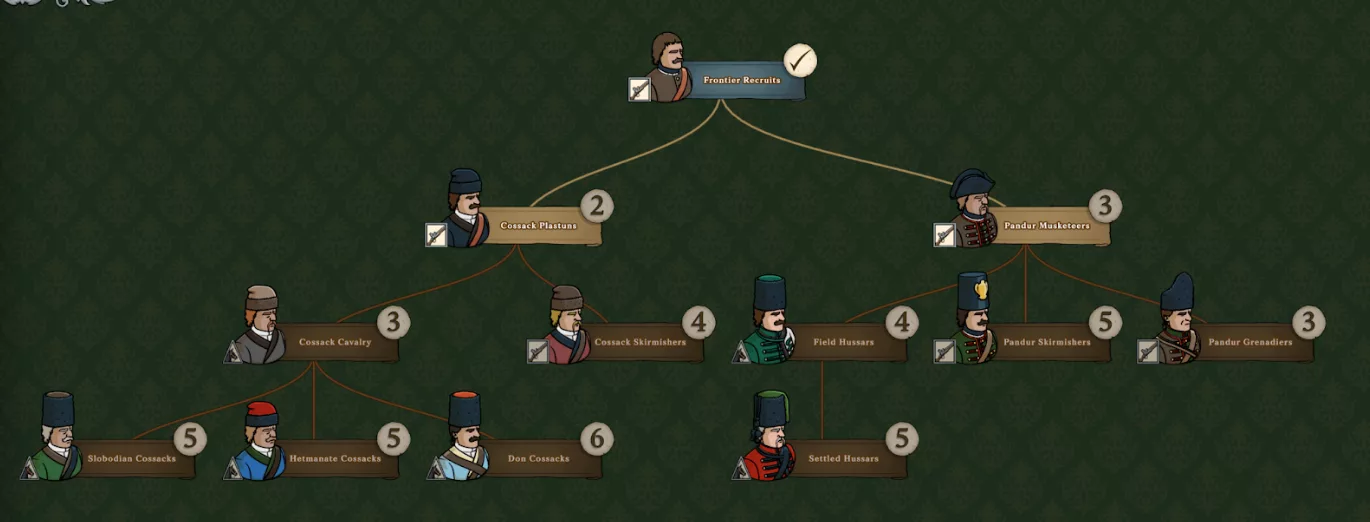 – Russia’s cossack contingent now starts with one of the new units, a cossack plastun light infantry. You can keep him as a plastun and upgrade him into a dismounted cossack who has decent light infantry stats or upgrade him into a regular cossack unit. While I like the cossack’s all mounted start, they remain one of the least popular army compositions and so hopefully this gives them a little more opportunity to play into a different strategy early on. Excellent lances added to the Russian cossack composition (lances are fitting for the cossacks), and their worn uniform item has been changed to excellent quality.