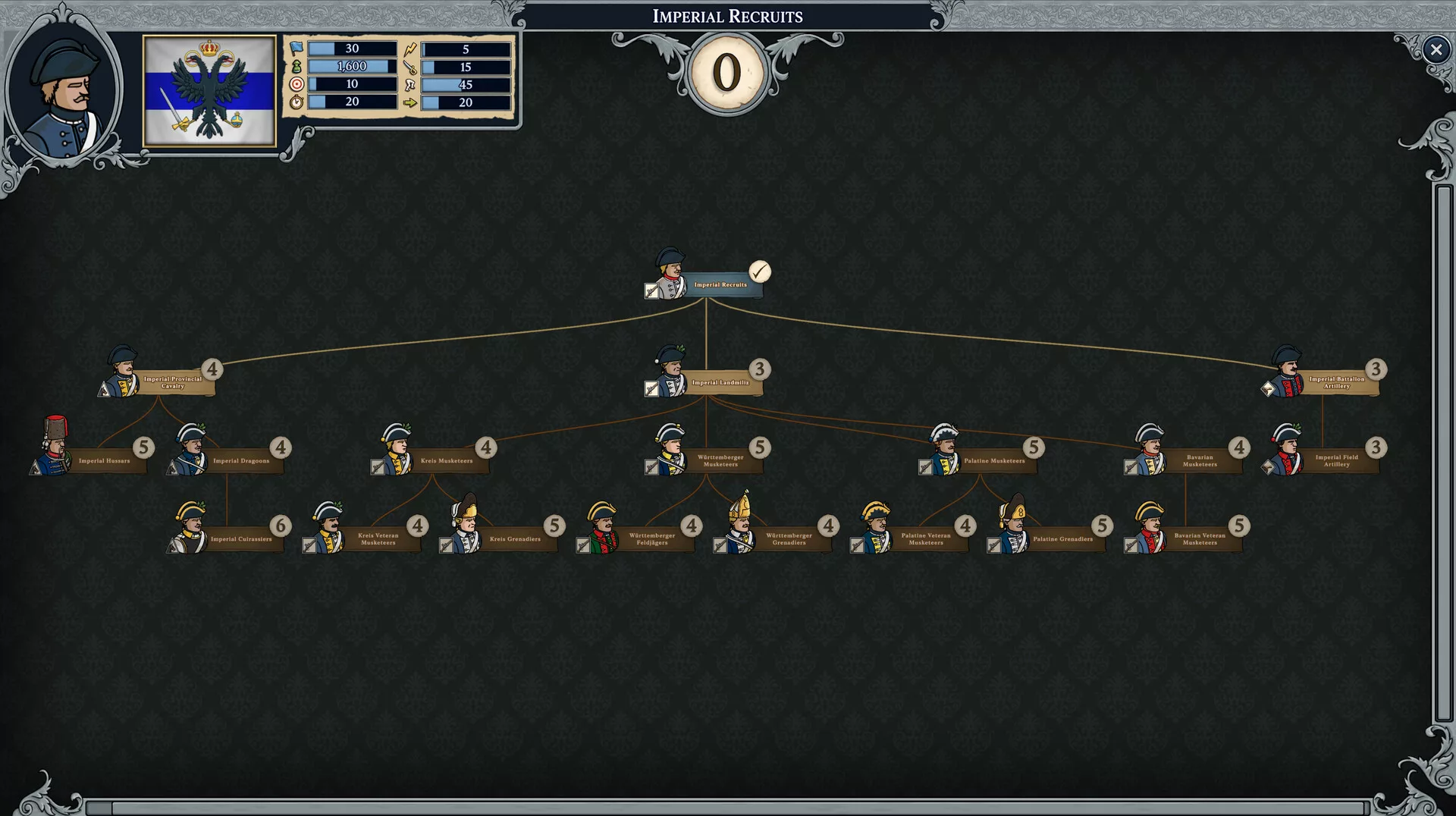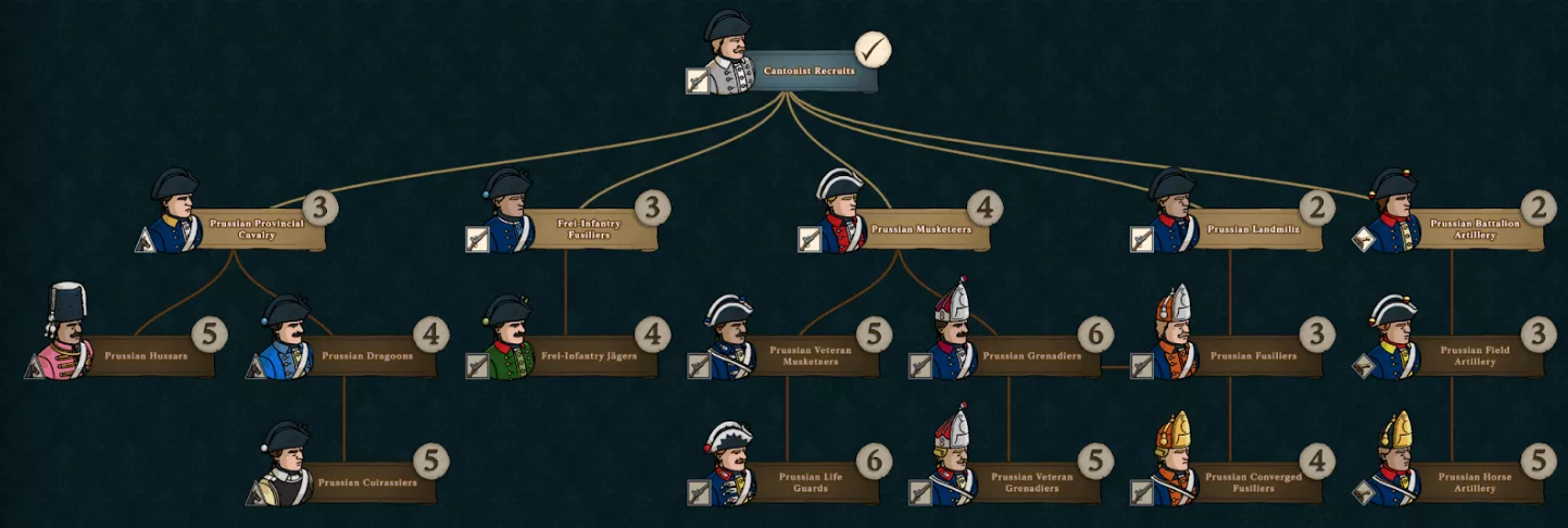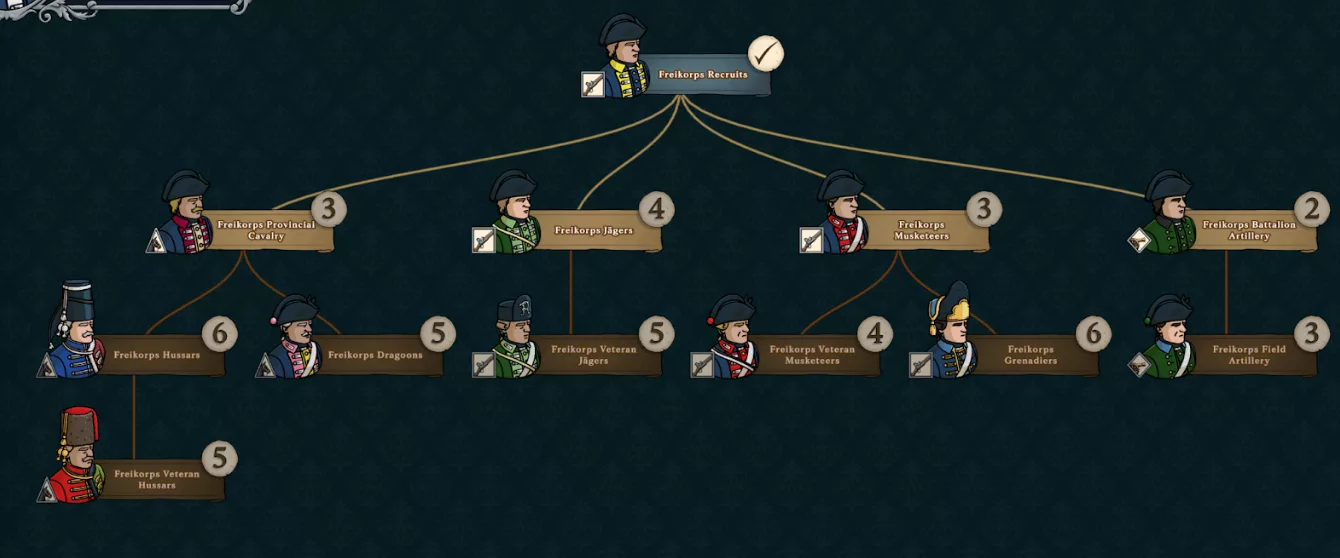 – Here are the HRE unit trees. They have a total of 40 units. The old standard amount of units per nation was 34, but HRE has increased that limit. Later in the changelog you’ll also see I ended up increasing the amount of units for every other faction in the game, bringing them all up to around 40. The first HRE tree is the main one which contains Kreis, Wurttemberg, Palatine, and Bavarian units.