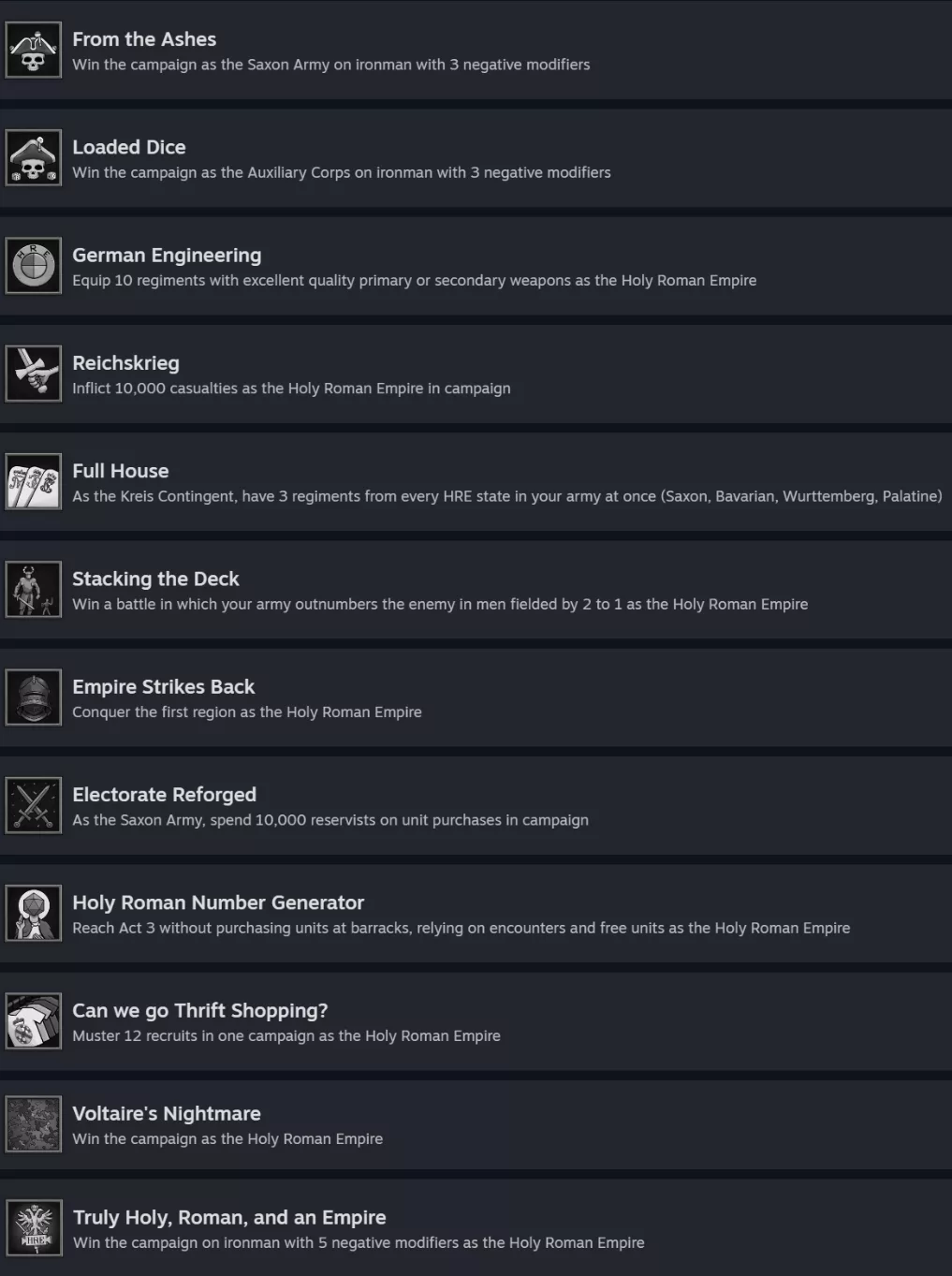 – 12 new HRE achievements added to the game. They follow the same convention of the other nation achievements.