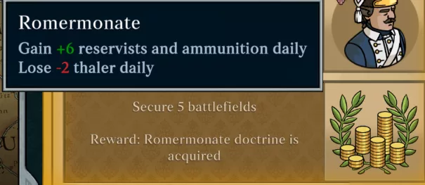 – (HRE-only) Romermonate has you paying a 2 thaler tax but receiving 6 reservists and 6 ammunition daily.