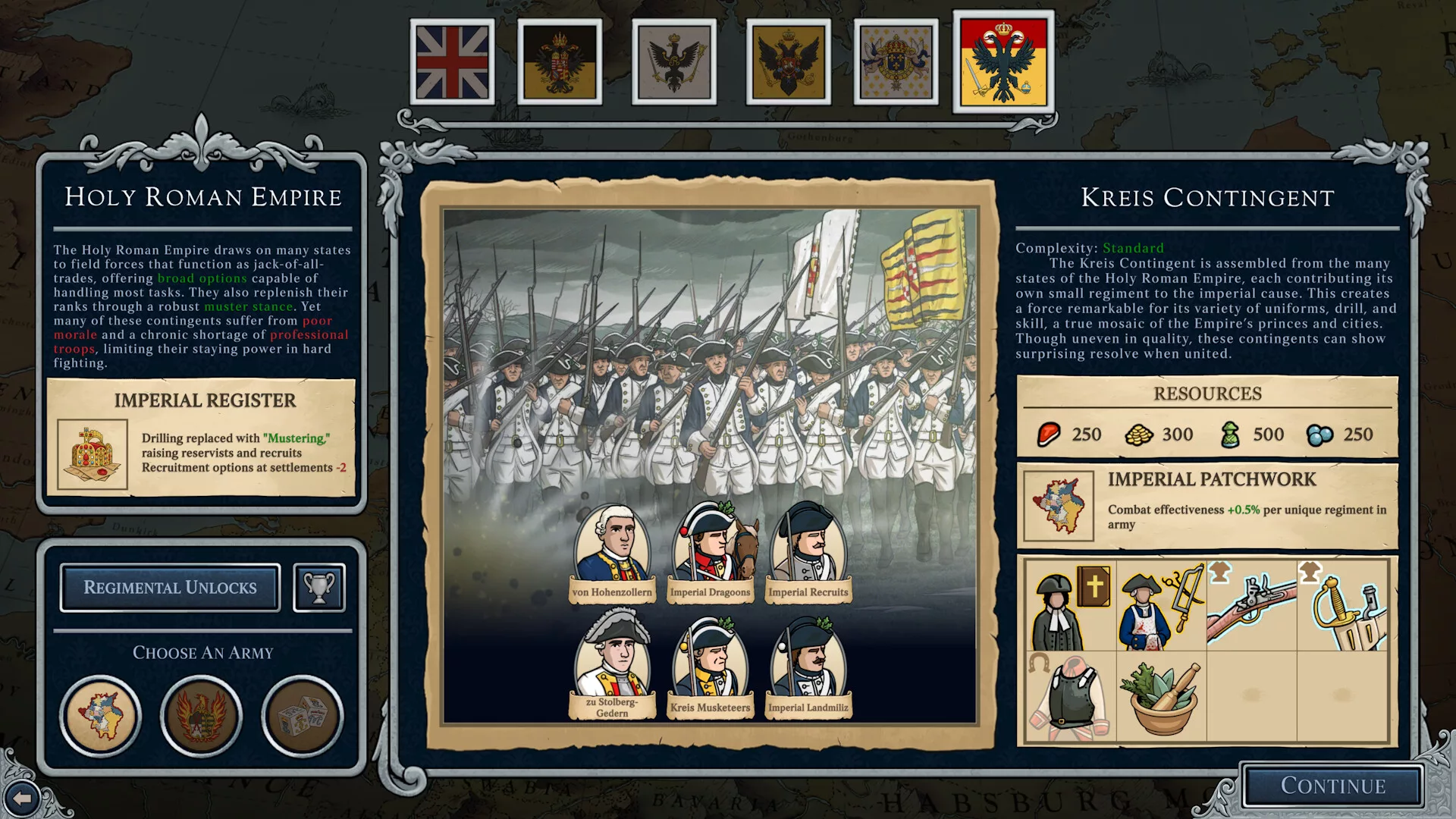 – Here are the three new army compositions for the HRE starting with the Kreis Contingent. They get a combat effectiveness buff for every unique regiment they field, so the more diverse your army the stronger they become.