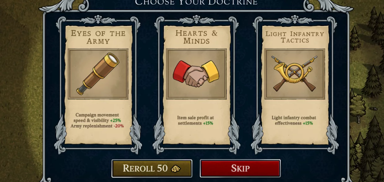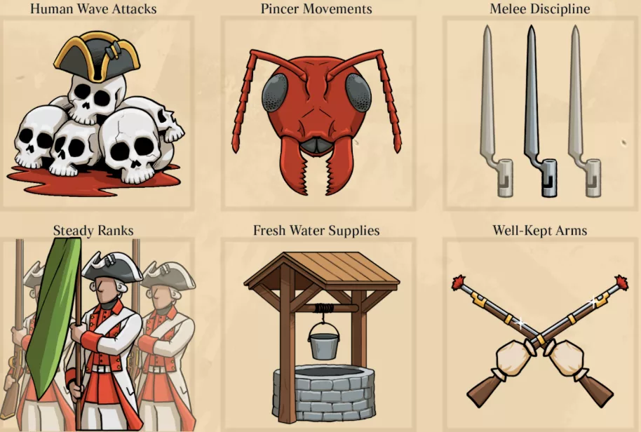 – 6 New doctrines have been added to the game. Human wave attacks boosts charge skill but decreases replenishment speed. Pincer movements improves flanking damage and movement speed. Melee discipline boosts melee skill. Steady ranks reduces morale damage received. Fresh water supplies gives a stamina buff. And well-kept arms buffs range and accuracy.