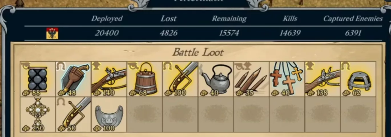 – Fixed a visual glitch with the battle aftermath screen. If you had 2 rows of loot, it would cover up the deployed/lost/remaining/kills/captured figures of your enemy. Notice in the image below we couldn’t see the enemy’s stats but only our own (shows just 1 flag).
