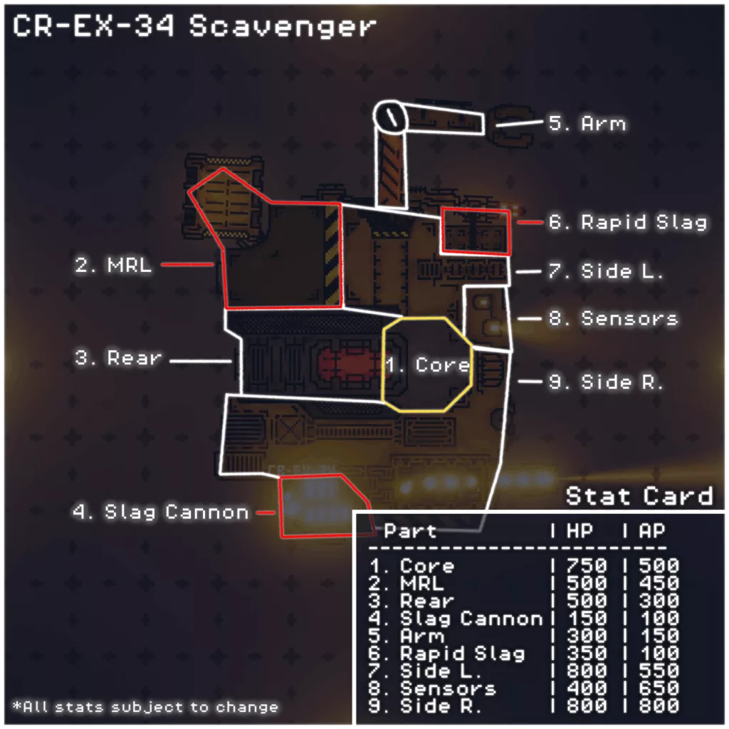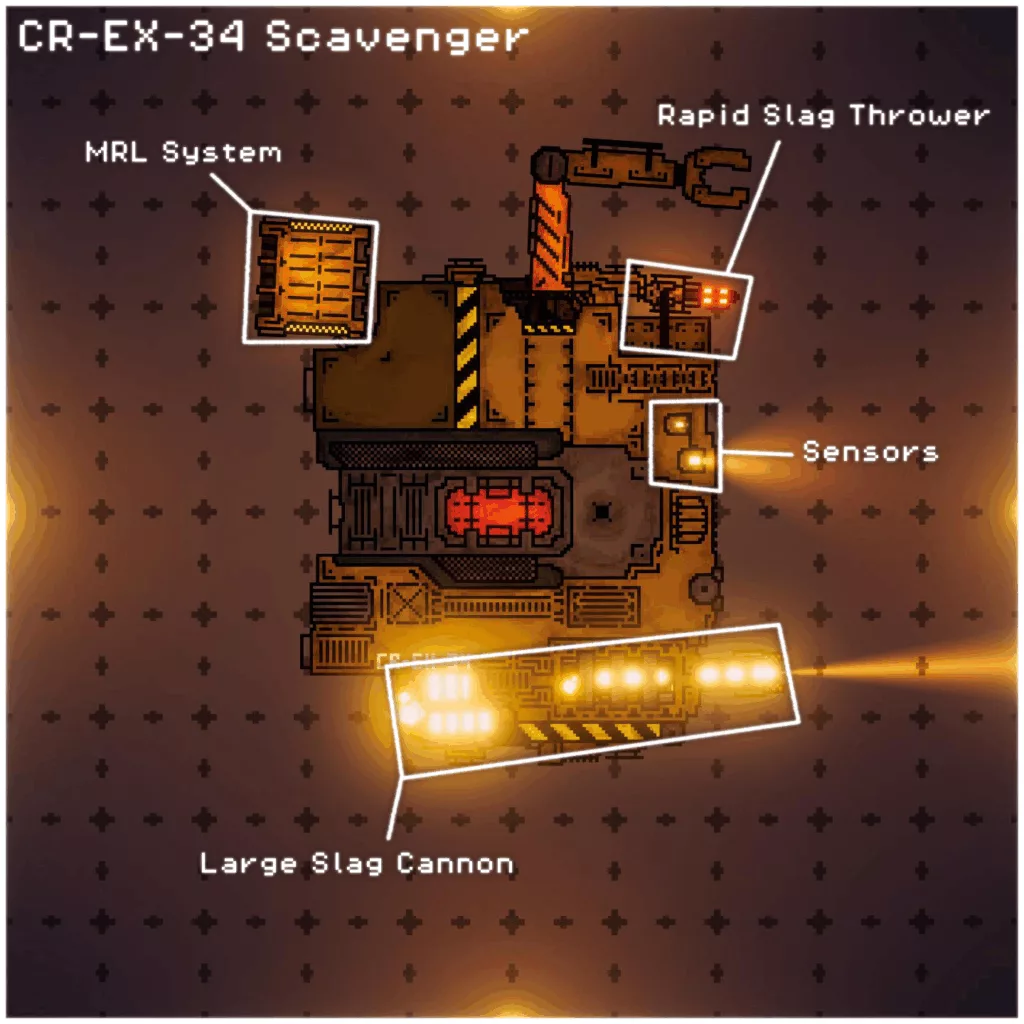 CR-EX-34 « Scavenger » – Heavy Fire Support The largest HIVE unit so far, and the first truly “original” HIVE design. Looking like a walking chunk of metal without much thought or reasoning in its design. It fields an impressive kit: rapid slag thrower (short-range), large slag cannon (mid-range) and an MRL artillery system (long-range).