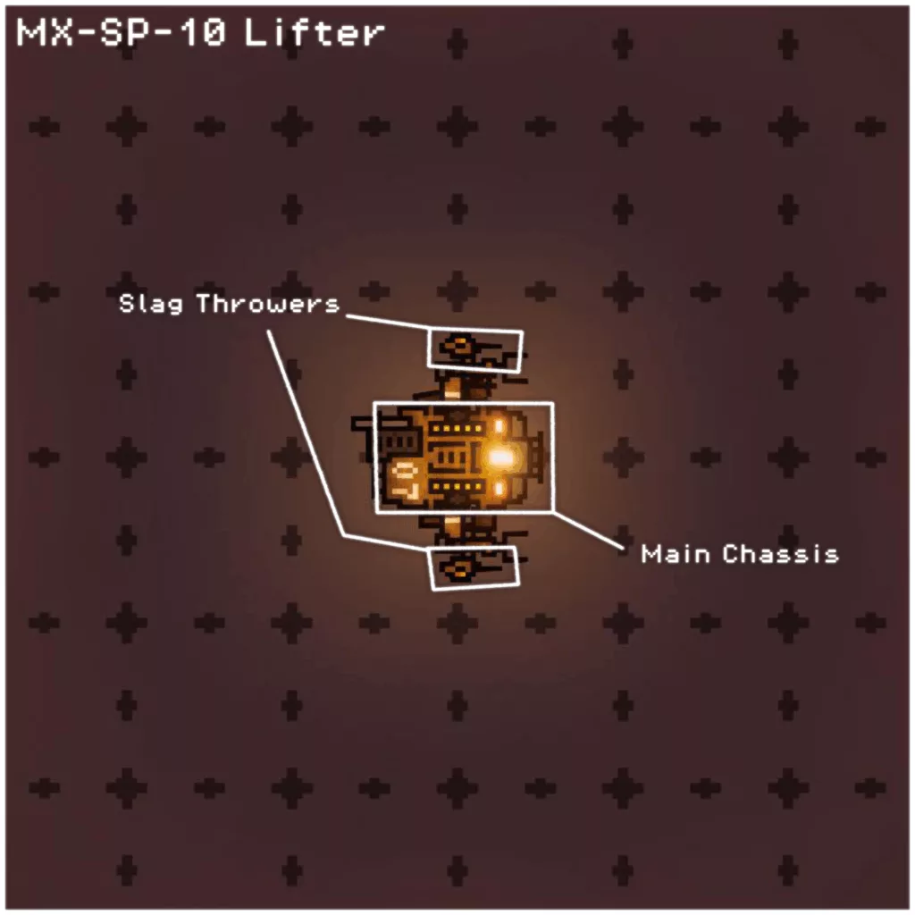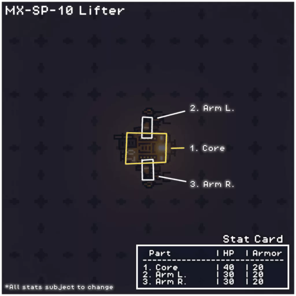 MX-SP-10 « Lifter » – Grunt A compact mech built from a forklift frame. Fitted with 2 pincher arms with slag throwers bolted on. These weapons fling superheated metal fragments. Cheap, crude and common, so you’ll see them often. They’ll try to close to short range where their weapons are most effective.