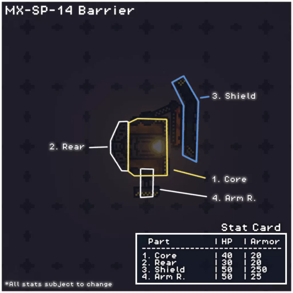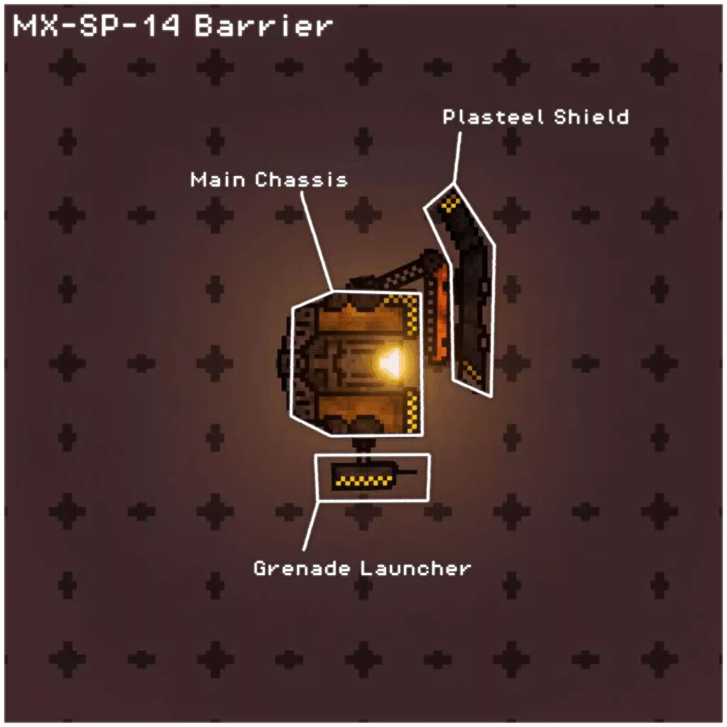 MX-SP-14 « Barrier » – Shield Carrier A small construction chassis rebuilt to carry a thick slab of plasteel as a shield, plus a grenade launcher in its off arm. The Barrier attempts to close the distance while tanking damage.