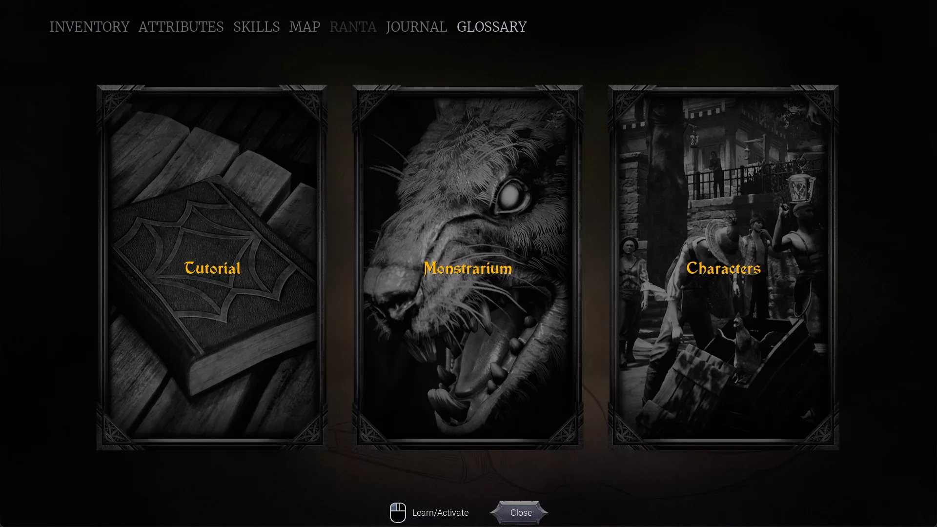 The character menu now features a Glossary, which includes three sections: Tutorials, Bestiary, and Characters.