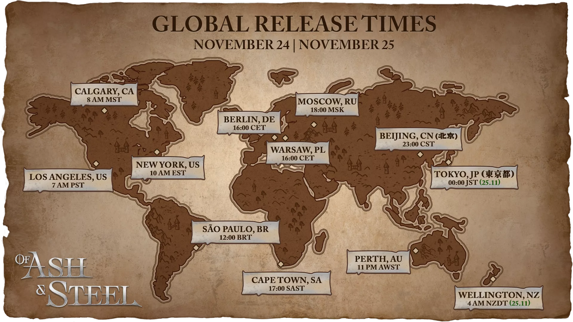 Of Ash and Steel sort la semaine prochaine, le 24 novembre . Nous saisissons cette opportunité pour vous exprimer notre gratitude pour le soutien dont vous avez fait preuve jusqu’à aujourd’hui. L’intérêt que vous avez porté au jeu sur lequel nous travaillons depuis toutes ces années nous va droit au cœur. Of Ash and Steel se veut la quintessence de tout ce que nous aimons dans les jeux vidéos. Avant tout, l’heure est venue de révéler le prix du jeu, l’heure à laquelle vous pourrez jouer, et vous rappeler les configurations système requises. C’est parti.