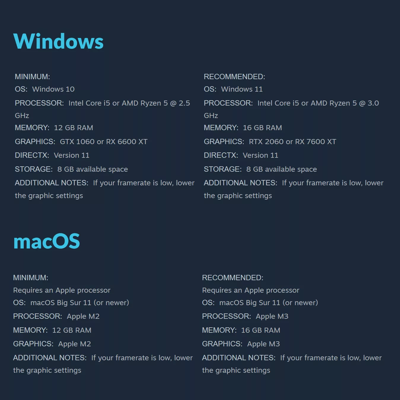 We’ve updated our Steam page and added the game’s minimum system requirements for PC and Mac 🙂