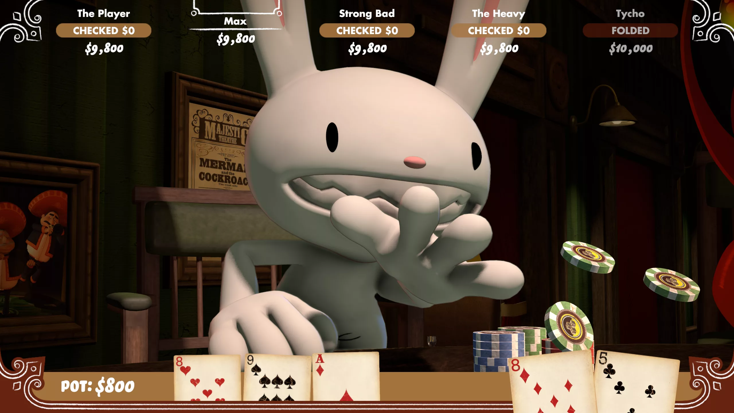 • The remaster has a bunch of new in-game unlockables. Just like in the original Poker Night, in the new release you can unlock new table felts and decks of cards by winning tournaments, and we’ve added a bunch more. And just like the original, some of the unlocks hold secrets that change how the game looks. We don’t want to spoil them all here, so keep an eye out as you play.
