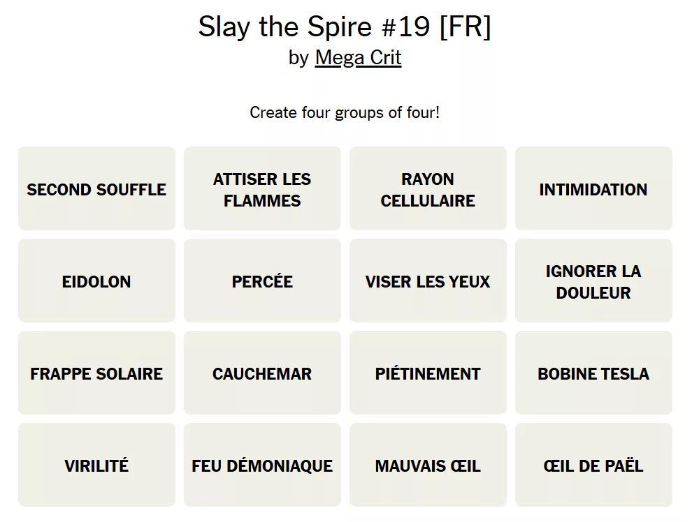 Pour ceux qui ne connaissent pas les puzzles connections, l’objectif est de regrouper les mots 4 par 4 selon des points communs. Ces points communs peuvent être dans le nom, la fonction, l’esthétique, ou même quelque chose d’abstrait. Si vous trouvez 3 ou bien 5 cartes qui ont quelque chose en commun, c’est peut-être que vous tombez dans un piège. La difficulté des catégories est globalement organisée par couleur : les jaunes sont censés être les plus faciles, puis les verts, les bleus, et enfin les violets – mais la difficulté est quelque chose de subjectif !