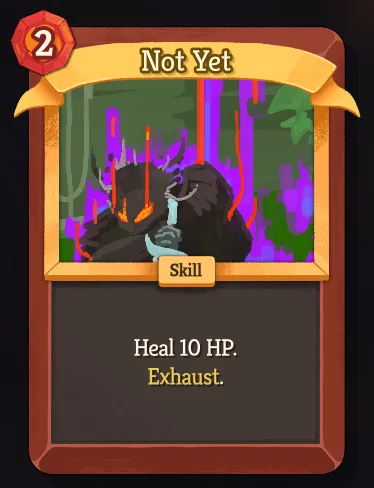 The Ironclad has received a new card, Not Yet : « Rare – Skill – Cost 2 | Heal 10(13) HP. Exhaust. » Some other cards of his– Dominate , Expect a Fight , Spite , and Stoke –have received reworks, while Grapple has been deprecated. Numerous cards have seen buffs, nerfs, and rarity changes. Many of these changes have come with the aim of giving him better survivability and Exhaust synergies.