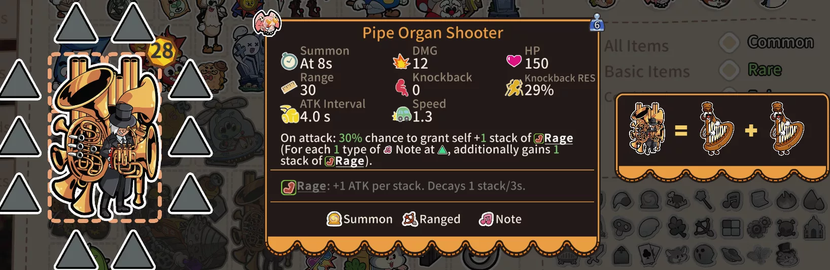 • Trumpet / Harp Archer: The buff effect area now grants +1 additional stack of Rage for each different Note-type item within the area.