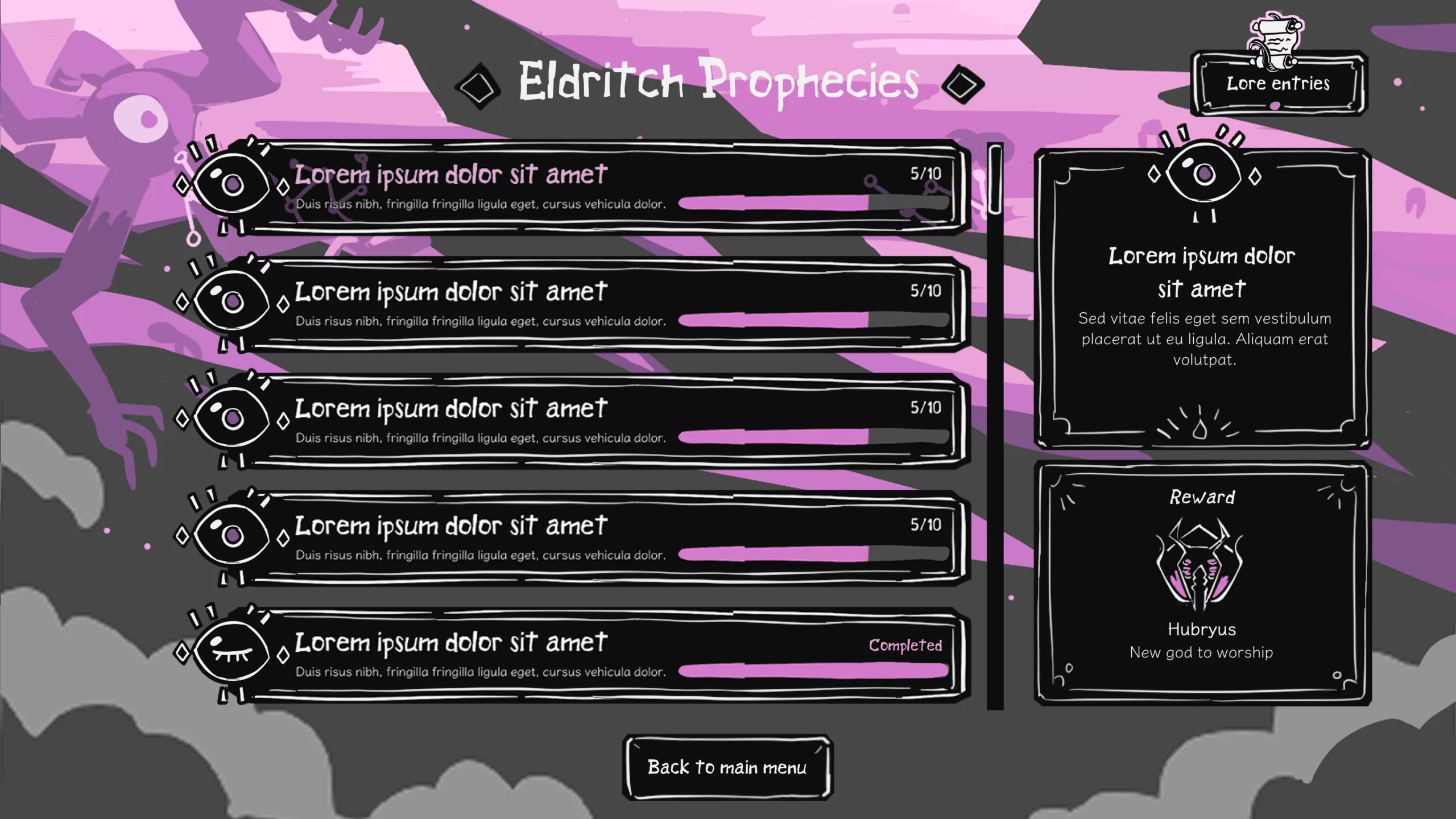 The Eldritch Prophecies is an entire sub-menu that should be accessible in the main menu. It is intended to serve as a way to keep track of your progress towards unlocking new content, upgrades, and lore entries.