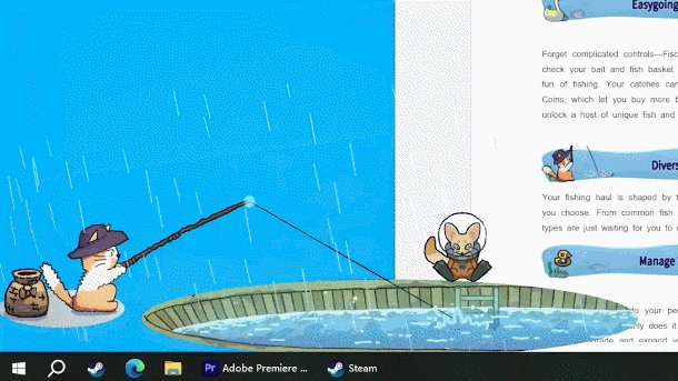Designed to adapt perfectly to your workflow, Fischer's Fishing Journey can be configured as a animated or pinned wallpaper in a corner of your screen. This flexibility allows you to take advantage of the soothing presence of Fischer without disturbing your activities. The dynamic landscapes that evolve naturally between day and night, as well as weather variations like rain or sun, help to create a living and immersive environment that reduces the monotony of long work sessions.
